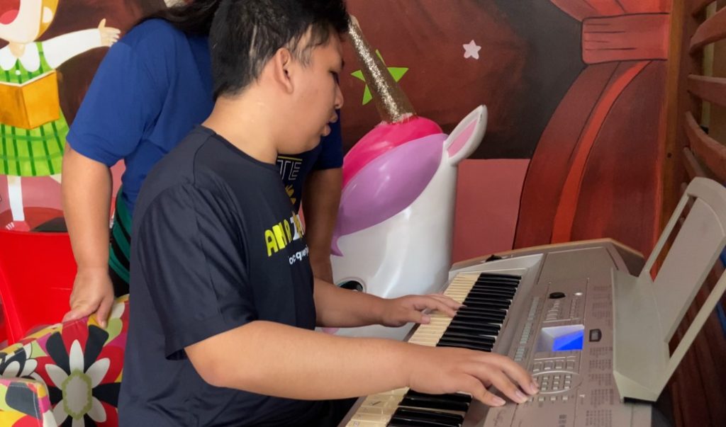 “Aqui o local que eu mais gosto é a sala de música. Apesar de eu não enxergar, por conta da doença, gosto muito de tocar teclado. Às vezes nós temos brincadeiras, às vezes também tem aula de teclado. Eu venho e quando não tem aula também peço permissão pra eu vir pra cá tocar e cantar”, relata.