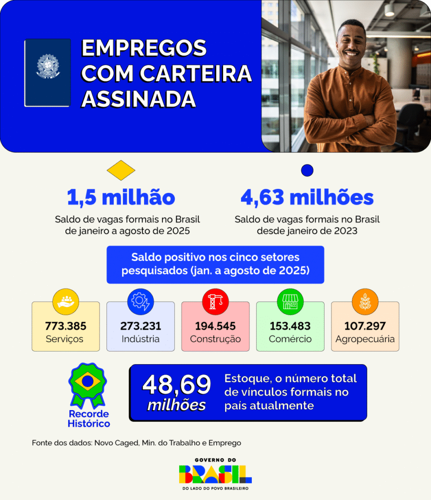 Entre janeiro e agosto de 2025, o Brasil criou 1,5 milhão de empregos formais, elevando o estoque de vínculos para 48,69 milhões, o maior da história. Desde janeiro de 2023, o saldo acumulado chega a 4,63 milhões de vagas.