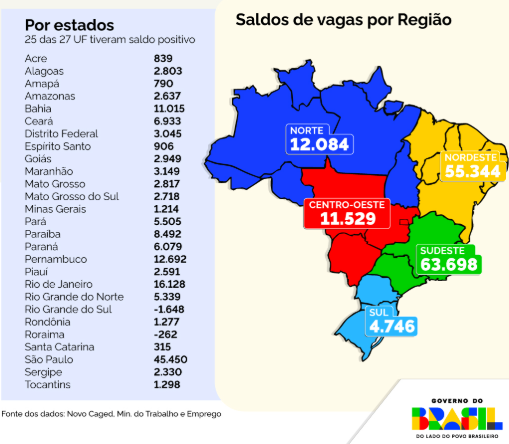 O Brasil abriu 147.358 novos empregos formais, resultado de 2.239.895 admissões contra 2.092.537 desligamentos. O saldo foi positivo em 25 das 27 Unidades da Federação.