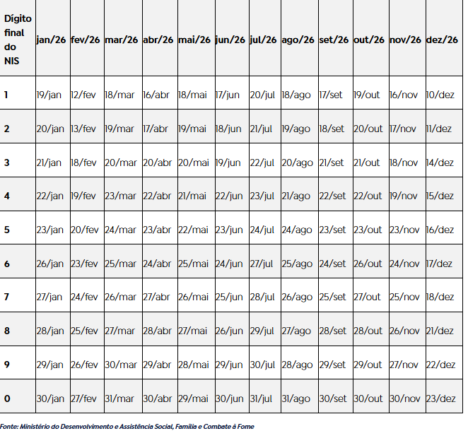 Nesta sexta-feira (26), as famílias com o Número de Inscrição Social (NIS) final 6 poderão sacar o pagamento do Bolsa Família. Este repasse faz parte do calendário anual do programa, que foi divulgado pelo Ministério do Desenvolvimento e Assistência Social, Família e Combate à Fome (MDS) para 2026.