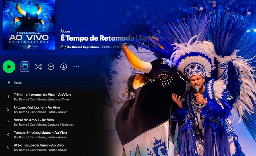 Em comemoração aos seus 112 anos, o Boi-Bumbá Caprichoso lançou nesta quinta-feira (16/10) o álbum digital “É Tempo de Retomada, Ao Vivo no Bumbódromo”, que já está disponível no Spotify. Gravado durante as três noites do Festival de Parintins, o projeto celebra a retomada do espetáculo azul com uma produção ao vivo que presenteia a torcida azulada com emoção, memória e música de alta qualidade. Ouça agora no Spotify clicando aqui.