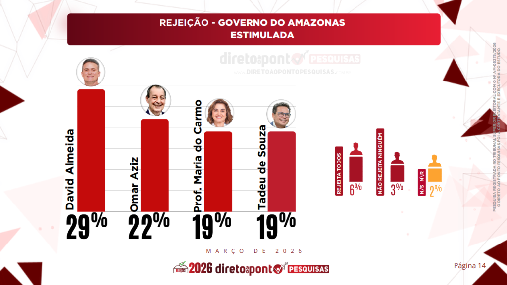 De acordo com a pesquisa, o prefeito de Manaus, David Almeida (Avante), aparece com o maior índice de rejeição entre os nomes testados, com 29%. Na sequência está o senador Omar Aziz (PSD), com 22%.