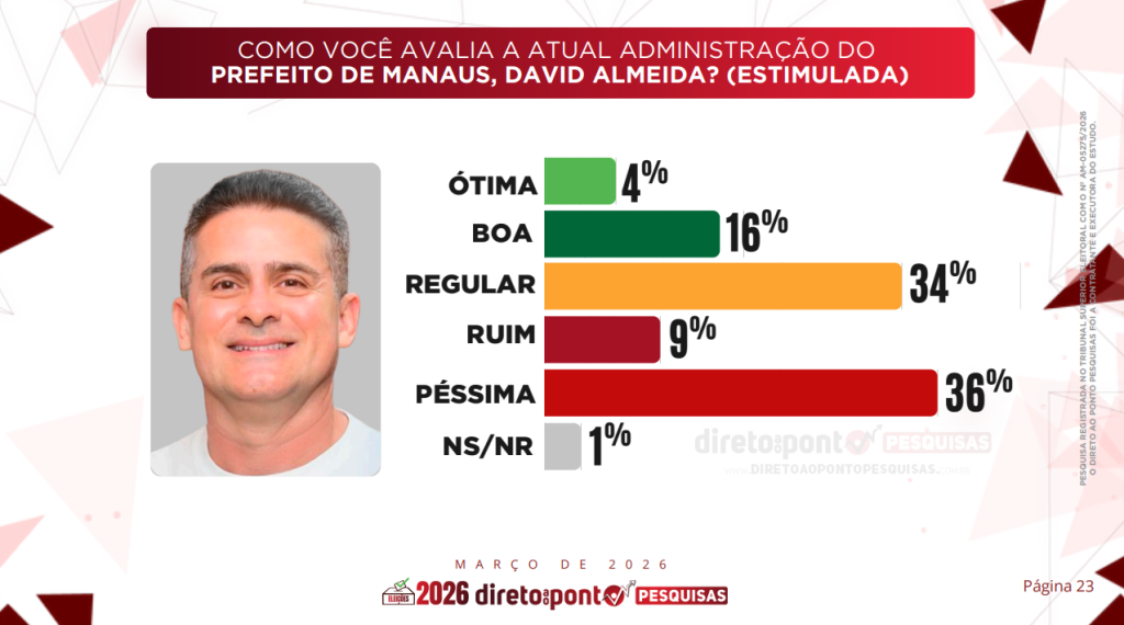 A avaliação da administração do prefeito de Manaus, David Almeida (Avante), apresentou piora no primeiro levantamento de 2026 divulgado pelo Instituto Direto ao Ponto Pesquisas.