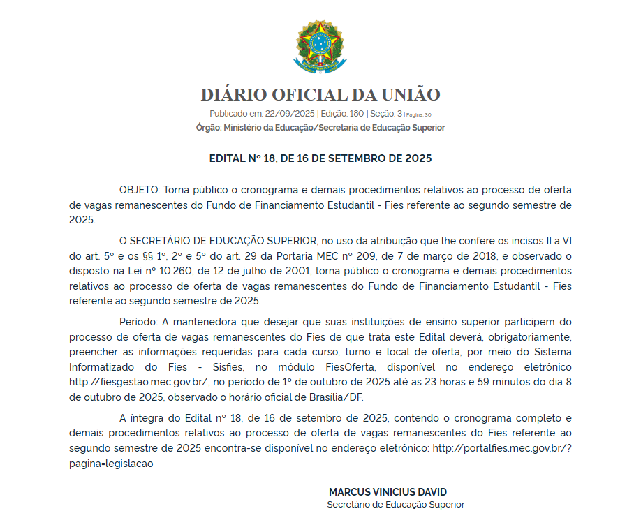 Nesta segunda-feira (22/9), foi publicado o edital para oferta de vagas remanescentes do Fundo de Financiamento Estudantil (Fies) no segundo semestre de 2025. O Edital nº 18/2025, divulgado no Diário Oficial da União, estabelece o cronograma e as diretrizes para que mantenedoras de instituições privadas de ensino superior participem do processo, que ocorrerá entre os dias 1º e 8 de outubro de 2025, por meio do sistema FiesOferta.