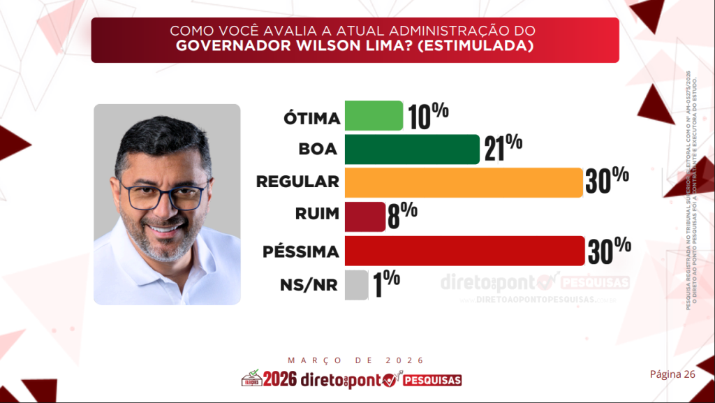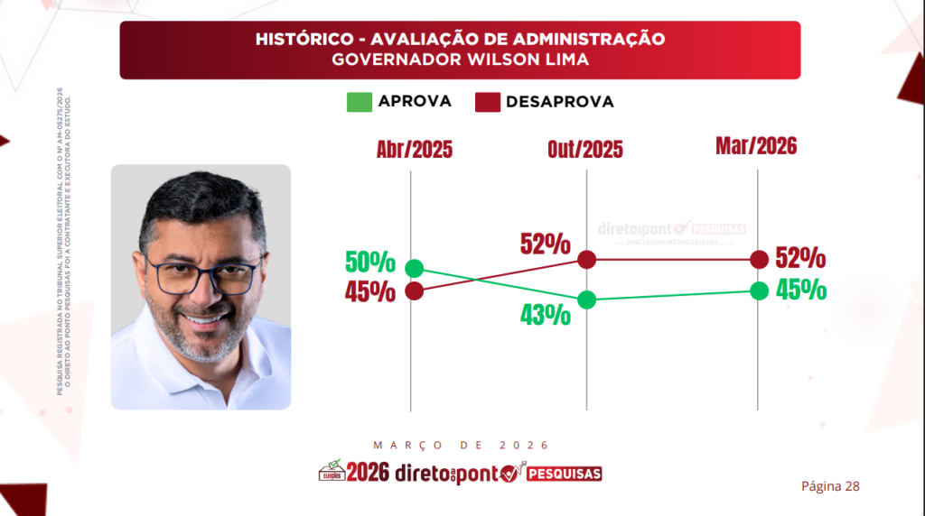 A administração do governador Wilson Lima (União Brasil) também foi avaliada no primeiro levantamento de 2026 do Instituto Direto ao Ponto Pesquisas, que indica um cenário de avaliação dividida entre os eleitores do Amazonas.