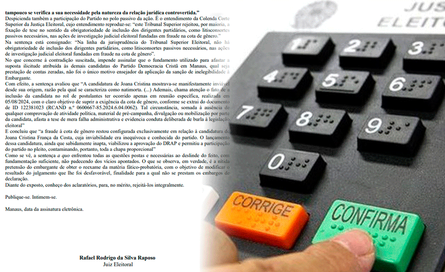 A Justiça Eleitoral decidiu manter a decisão que aponta fraude à cota de gênero praticada pelo partido Democracia Cristã (DC) nas eleições municipais de 2024, em Manaus. Com isso, continuam válidas as penalidades aplicadas: a anulação de todos os votos recebidos pelo partido na capital amazonense, a cassação dos registros dos seus candidatos e a declaração de inelegibilidade de Joana Cristina França da Costa, uma das candidatas apontadas como fictícias.