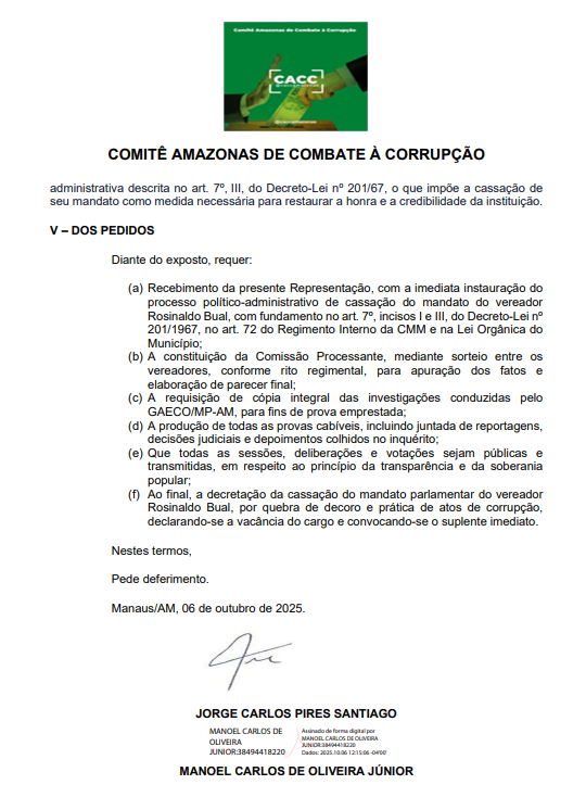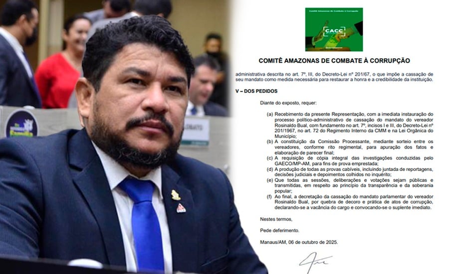 O Comitê Amazonas de Combate à Corrupção protocolou, nesta segunda-feira (6/10), uma representação na Câmara Municipal de Manaus (CMM) solicitando a abertura de processo político-administrativo para a cassação do mandato do vereador Rosinaldo Bual (Agir). O pedido foi endereçado ao presidente da Casa, vereador David Reis (Avante), e é assinado por seis advogados que integram a coordenação do Comitê.