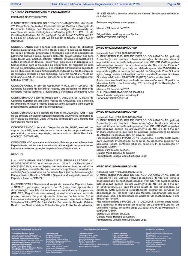 O Ministério Público do Estado do Amazonas (MP-AM) instaurou procedimento preparatório para apurar suspeitas de nepotismo na administração municipal de Manaus. A medida foi adotada após denúncia que aponta a possível nomeação de familiares do ex-prefeito David Almeida em cargos dentro de secretarias, especialmente na Secretaria Municipal de Juventude, Esporte e Lazer (Semjel). A Portaria está publicada no Diário Oficial do órgão, datado de 27 de abril deste ano.