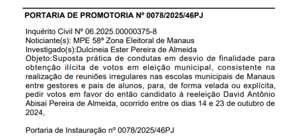 A investigação foi formalizada por meio da Portaria nº 0078/2025/46PJ, publicada na terça-feira (16/12), e apura a finalidade da realização de reuniões coordenadas por Dulcineia Almeida em unidades da rede municipal de ensino, entre os dias 14 e 23 de outubro de 2024. Segundo o MPAM, nesses encontros, gestores escolares teriam sido orientados a convocar pais de alunos para eventos nos quais ocorreram pedidos de apoio eleitoral, de forma velada ou explícita, em favor do então candidato à reeleição, o prefeito David Almeida (Avante).