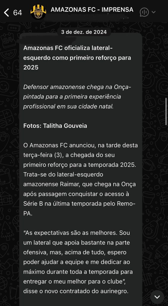 Depois de Raimar, em 13 de dezembro de 2024, a Onça anunciava o volante Eliton Júnior que foi outro a não seguir na temporada. Fez apenas 14 jogos. Aí você deve pensar: e o que de errado tem nisso, sendo que é comum jogadores não darem sequência? Pois é, normal é. Agora você imagina o Amazonas administrar situações semelhantes a essas com 75 jogadores?