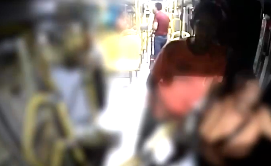 O crime foi registrado pelas câmeras de segurança instaladas no interior do ônibus. As imagens mostram o momento em que os suspeitos se levantam e anunciam o assalto.
