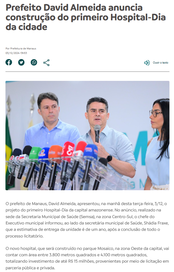 Enquanto o Hospital-Dia não avança, a promessa feita pelo prefeito permanece sem cumprimento, transformando o projeto que antes era apresentado como um marco para a saúde municipal em mais um exemplo de obra anunciada e distante da realidade dos manauaras.