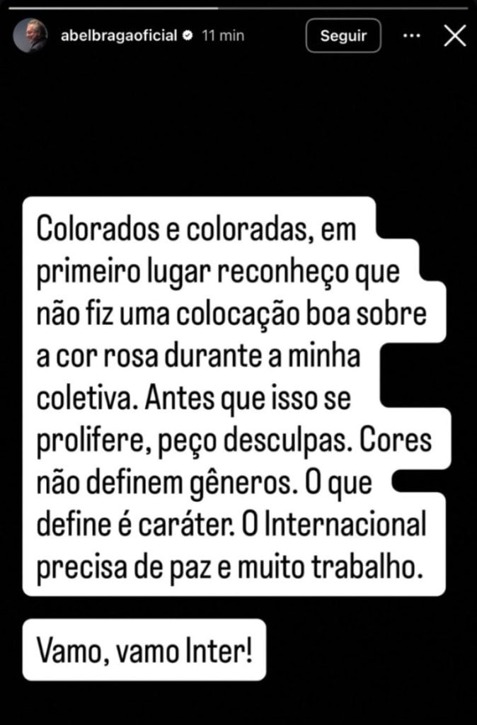 Detalhe, o Abel diz isso muito próximo da fala do ex-treinador do Inter Ramon Díaz (demitido nesse fim de semana após goleada sofrida do Inter para o Vasco). A diferença é que o anterior atacou as mulheres e também disse depois que foi infeliz na brincadeira. Aliás, falei sobre o caso aqui. A desculpa do Abel depois através de nota foi ainda mais vergonhosa, porque ele cita uns pontos engraçados. Vamos lá: