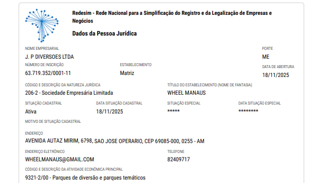Informações da Receita Federal revelam que a empresa J. P. Diversões LTDA, responsável pela marca Wheel Manaus, foi criada recentemente, na terça-feira (18/11). O único sócio administrador é Jean Marcos Praia Rocha, diferente dos proprietários da H. M. Diversões Ltda., empresa mencionada no termo de cessão firmado com a prefeitura.