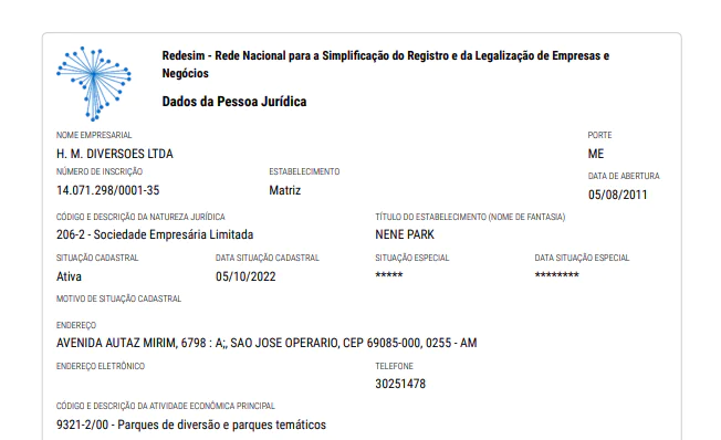 Outro ponto observado é que ambas as empresas registram o mesmo endereço: Avenida Autaz Mirim, nº 6.798, no bairro São José Operário, zona Leste, localização próxima ao parque de diversões. O compartilhamento do endereço sugere que as duas companhias podem operar a partir do mesmo espaço físico.