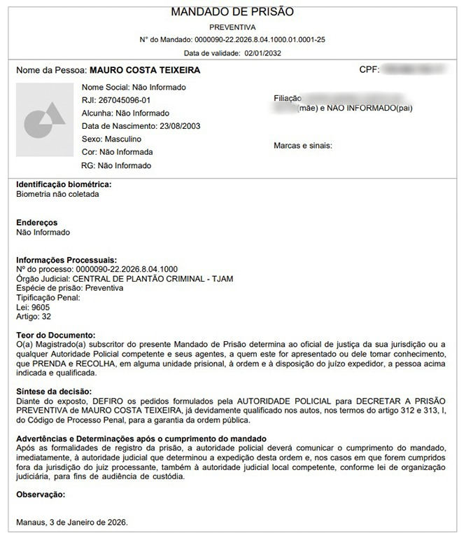 O suspeito havia sido detido inicialmente na sexta-feira (02/01), quando foi conduzido ao 6º Distrito Integrado de Polícia (6º DIP) para prestar depoimento. Após o procedimento, ele foi liberado. Com o avanço das investigações e diante da gravidade dos fatos, a Justiça do Amazonas determinou a prisão preventiva.