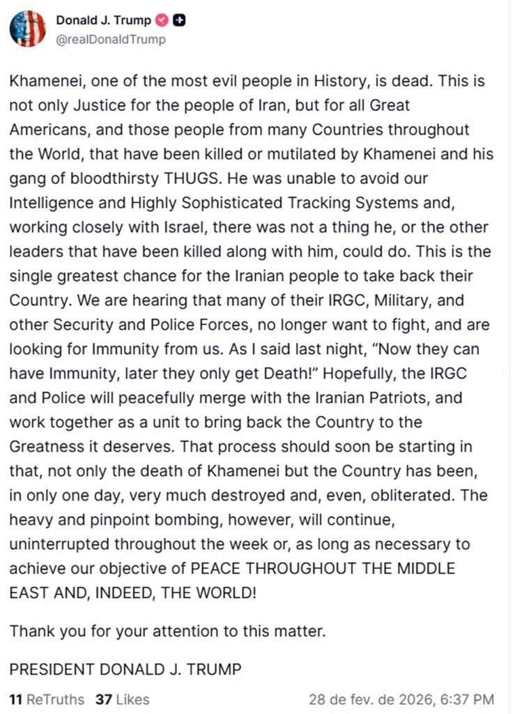 “Khamenei, uma das pessoas mais malignas da História, está morto. Isso não é apenas justiça para o povo do Irã, mas para todos os grandes americanos e para pessoas de muitos países ao redor do mundo que foram mortas ou mutiladas por Khamenei e seu bando de capangas sanguinários. Ele não conseguiu escapar de nossos sistemas de inteligência e de rastreamento altamente sofisticados e, trabalhando em estreita colaboração com Israel, não havia nada que ele, ou os outros líderes mortos junto com ele, pudessem fazer.