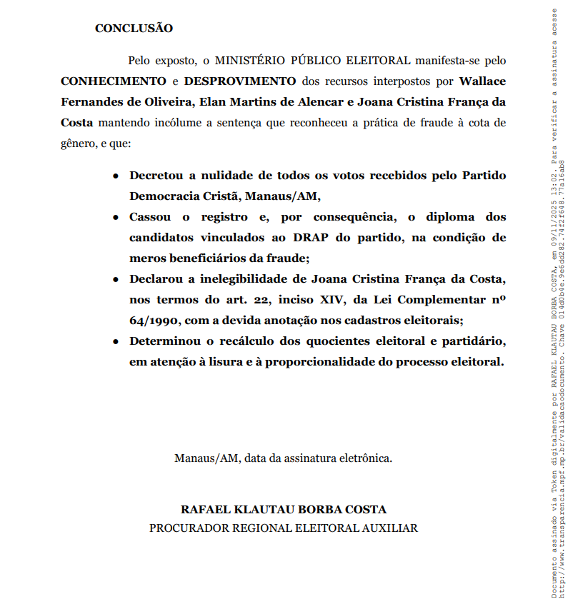 O vereador Elan Alencar (DC) teve o mandato cassado pelo Ministério Público Eleitoral, nesta terça-feira (11/11), por fraude à cota de gênero nas eleições municipais de 2024, em Manaus. A decisão também reconhece a irregularidade das candidaturas femininas apresentadas pelo Partido Democracia Cristã (DC), determinando a nulidade dos registros e diplomas de todos os candidatos vinculados ao Demonstrativo de Regularidade de Atos Partidários (DRAP) da legenda.